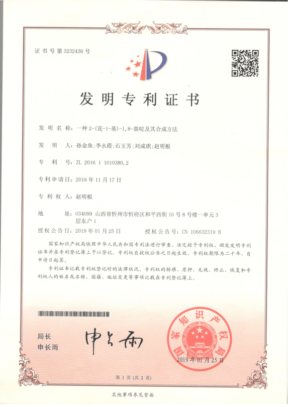 [9]孙金鱼,李永霞,石玉芳,刘成琪,赵明根.一种2-(芘-1-基)-1,8-萘啶及其合成方法。ZL 2016 1 1010380.2