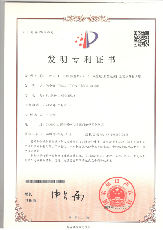 [10]孙金鱼,王桂林,石玉芳,刘成琪,赵明根.一种4,4'-二(3-氨基苯)-2,2'-双噻唑pH荧光探针及其制备和应用。 ZL 2016 1 0508153.6