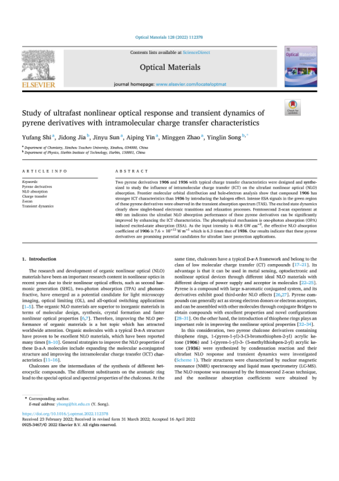 [1] Yufang Shi, Jidong Jia, Jinyu Sun, Aiping Yin, Minggen Zhao, Yinglin Song*. Study of ultrafast nonlinear optical response and transient dynamics of pyrene derivatives with intramolecular charge transfer characteristics[J].Opt. Mater.,2022, 128: 112378. (SCI 2区,IF = 3.9,被引用4次)