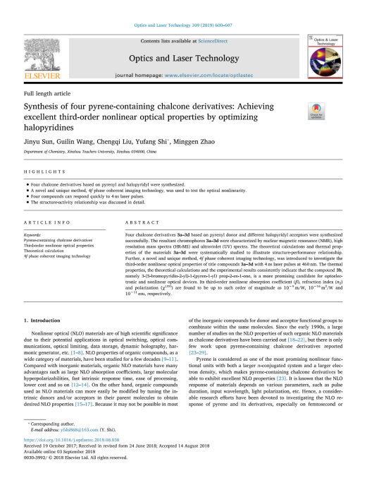 [2] Jinyu Sun, Guilin Wang, Chengqi Liu, Yufang Shi*, Minggen Zhao. Synthesis of four pyrene-containing chalcone derivatives: Achieving excellent third-order nonlinear optical properties by optimizing halopyridines[J].Opt. Laser Technol., 2019, 109: 600-607. (SCI 2区,IF = 5.0,被引用26次)