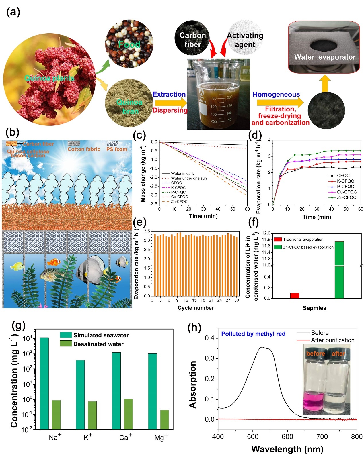 通过化学手段提取藜麦麸皮中的纤维素,低温与碳纤维粉末混合,然后高温碳化活化,制备藜麦包覆碳纤维复合材料(如下图a所示)。该气凝胶表现出良好的水汽生产性能(下图c、e)、高的太阳能驱动水汽蒸发速度(3.2 kg m-2h-1,下图d)、海水淡化后生产的清洁水符合世界卫生组织要求(下图g)。另外该材料还可以处理有机污染废水(下图h)。(Scientific Reports, 2022,12, 8777)