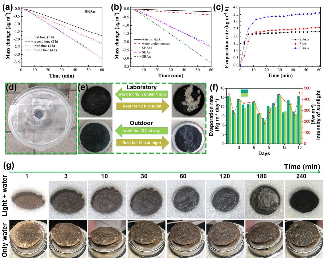 通过化学手段提取藜麦麸皮中的纤维素,然后与氧化石墨烯复合,制备出藜麦纤维素/氧化石墨烯气凝胶。该气凝胶表现出良好的自变黑性能(上图g)、高的太阳能驱动水汽蒸发速度(3.6 kg m-2h-1,上图a、b、c)和良好的自清洁性能(上图e),另外在户外实验中表现出良好的耐久性和稳定的水汽蒸发速率(上图d、f)。(Advanced sustainable systems, 2022,1, 2100350)