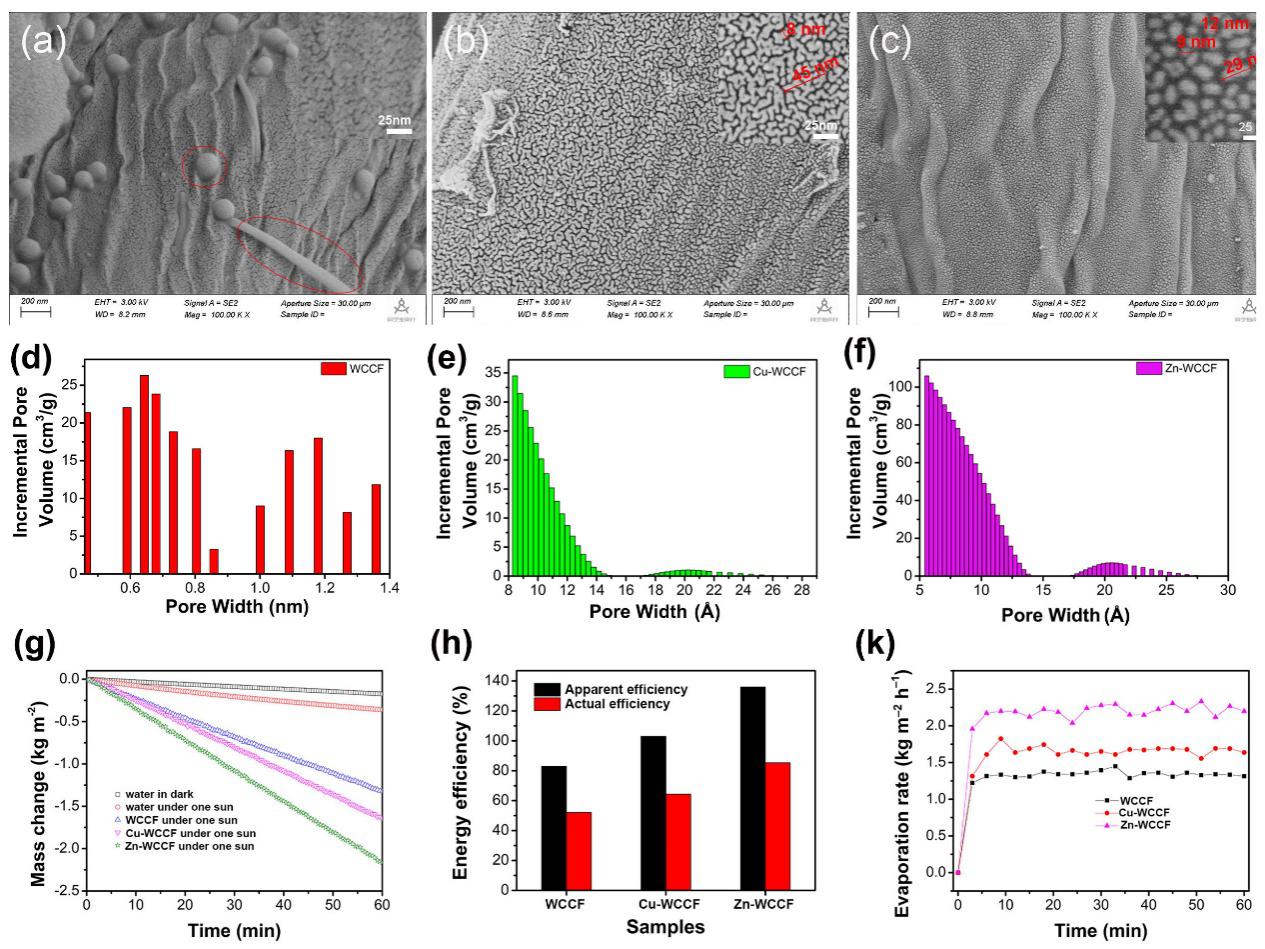 通过金属盐ZnCl2、CuCl2对柳絮表面进行高温活化(800 ℃),获得了如下图所示的截然不同的表面形貌特征和微观结构(下图a、b、c),同时其比表面积和孔径分布也得到很大的改善(下图d、e、f)。该气凝胶的在一个太阳光强度(1000 W m-2)下蒸发速率高达2.16kg m-2h-1(下图k)。高蒸发速率主要归因于表面纳米结构的形成,有效的降低其吸收水的蒸发焓所致。(Advanced sustainable systems, 2021,5, 2100122)